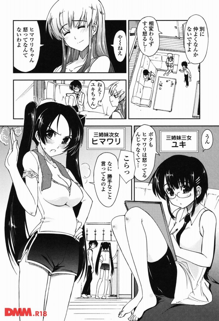 三姉妹の××××が気持ちよすぎて…もうっ!両親の再婚によりお隣の高井家の三姉妹と、ある日突然家族になってしまったアキラ。長女サクラ(AVライター)三女ユキ(エロ同人作家)に迫られまくる日常と次女ヒマワリ(コスプレイヤー)との甘酸っぱい恋愛模様・三姉妹との3P4P