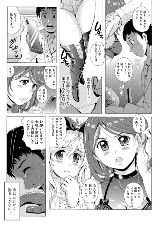 電車で乗り合わせたのは、ちらちらパンツが見える際どい格好に、大胆な絶対領域を強調するブーツ姿の美少女ふたり組み。対面に腰かけた男は、興奮のあまりふたりを隠し撮りをするが、それが彼女たちにバレてしまう……! 美少女ふたりに詰め寄られ、人生終了かと思いきや「許してほしければブーツを口でキレイにしなさい」と願ってもない要求をされて――!?