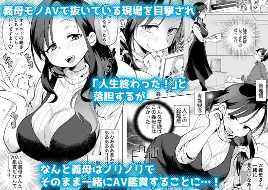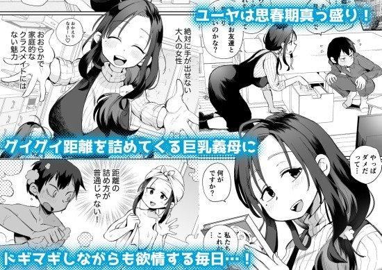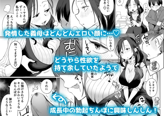 思春期真っ盛りの主人公、ユーヤの気になる存在…それはグイグイ距離を詰めてくる巨乳義母! ある日、義母モノAVを見てオナニーしているところを目撃され、「人生終わった!」と落胆するが、なんと義母はノリノリでそのまま一緒にAV鑑賞することに…! AVに発情した義母はどんどんエロい顔に…どうやら性欲を持て余しているようで、成長中の勃起ちんぽに興味しんしん! 「AVと同じことしてあげます…」 義母のエロテクで射精&潮噴き!理性は崩壊寸前! そして自らも快楽を求めユーヤに跨って… 成り行きのAV観賞から火が点いたドスケベ義母とヤリたい盛り義息子、 ぶつかり合う性欲の行方は…!?