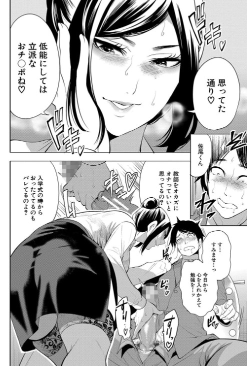 こんなとびきりのデカチ×ポは久しぶり…! 絶対に逃がさないわよ! ボッキ不可避! フェロモン溢れる熟女教師達! エロ動画にドハマリしてしまった俺・佐尾巽は受験に失敗し、勉強に集中するため全寮制の男子校へ入学した。 しかしそこへ新たに赴任してきたのが、フェロモンだだ漏れの熟女教師達だったのだ! ちょっと待ってくれ、俺がドハマリしたのは「熟女AV」なんだ!!! 教室内に漂う熟女フェロモンにガマン出来ず、トイレでシコっているのを古蜜先生に見つかってしまった! しかし俺のチ〇ポを見た古蜜先生は…!? 欲求不満なエロモンスター、古蜜先生で童貞喪失! 乳輪デカめな聖母の熟パイ、河合先生の手コキ授乳! 武股先生の女獣杭打ちピストンで嫐られる堕チ〇ポ! むちむち柔肉、伊ケ谷先生の濃厚ローションマ〇コ! どうなっちゃうんだ!? 俺のスクールライフ!!!