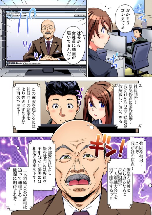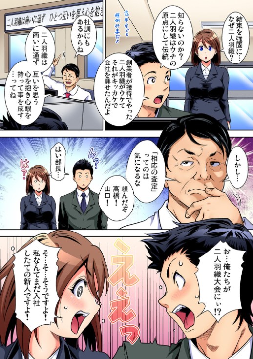 「私のココにも…先輩の熱いモノください!」彼女と密着してこんな展開になるなんて!ありがとう二人羽織ィ――ッ! 俺の勤める色満商事で、社員の結束向上を目的に‘二人羽織大会’が開催される事に?! 上司命令には逆らえず、後輩の山口さんと二人羽織を練習していたら――。 後ろにいる山口さんの熱い吐息や、柔らかいおっぱいの感触が伝わってきて…! 動くたびにそんなスリスリされたら、俺の下半身も…そりゃ固くなるよ! そしたら「コレ…何とかしないと練習できませんよね」と羽織の中で密着したまま、 山口さんの手が俺のアソコを弄りはじめて…! お互い身体も心も0センチの距離で、会社に内緒の特訓が始まる――?!