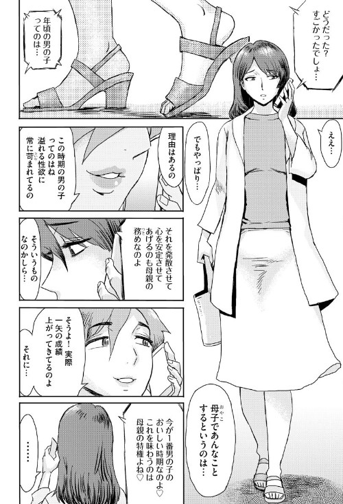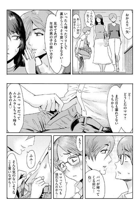 単身赴任から戻ってきた夫と一晩の情事を交わした鞘華。だが疲れた夫はすぐ寝入ってしまい、ひとりで熟れた体を慰めていた。息子の健斗は父母の部屋から漏れてきた音が気になり母の艷やかな姿を覗いてしまい、鞘華を「『母』も『女性』なのだ」と気づいてしまい、たかぶる股間を握りしめ母同様に自慰をしはじめ…。鞘華は健斗の様子をおかしく思い友人に相談をしたのだが、なんとその友人は息子との性的関係を暴露しはじめ…!?