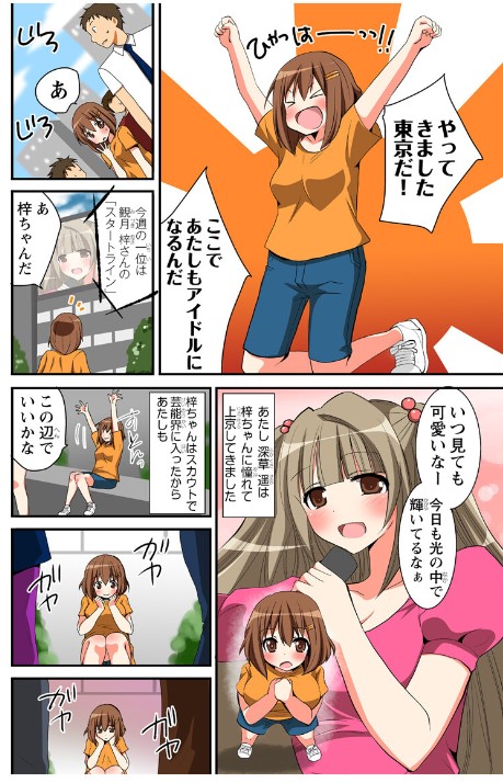 光輝くアイドル目指して、とりあえず上京した遥(はるか)。繁華街でスカウト待ちするが、なかなか声はかからない。なんとかポニテ少女・由宇(ゆう)と地下アイドルユニットを組むことになるが、芸能界につきもの(!?)のマクラ営業を強要され?「AV女優になるには必要でしょ」「やめてぇ、あたしはアイドルになりたいの!」「AVもアイドルも変わんないってー」「ちがうぅ、やだああ!」。一方、人気美少女アイドルの梓(あずさ)は、スキャンダルを見逃してもらう代わりにディレクターに身体を差し出していた。「あ、いや、やぁ、にゃぁああああ、きもちいぃ!」「おしりの穴、丸見え」「だめ、奥にきてるぅ!」光の舞台目指して励まし合い頑張る3人の女の子たちの、影の努力とハードなレッスン! 彼女たちがたどり着いた世界とは?
