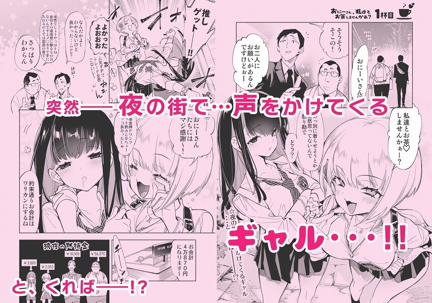 夜の街、二人のギャルにナンパされて入ったお店は・・・コラボカフェ!? 無事に推しをゲットしたオタギャル達からのお礼はモチロン・・・(はーと) 「ピュッピュするならおクチとおま○こ、どっちがい〜い?」 銀髪ショートさん×細いおにーさん&黒髪ロングさん×太いおにーさん、 二組の‘お茶トモ’が色んなところでカラダでお付き合い(はーと) しちゃいますっ 大好評「おにお茶」シリーズが待望の単行本仕様総集編になりました!! 第1巻は『おにーさん、私達とお茶しませんかぁ?』1〜6+番外編の計7作品を収録です