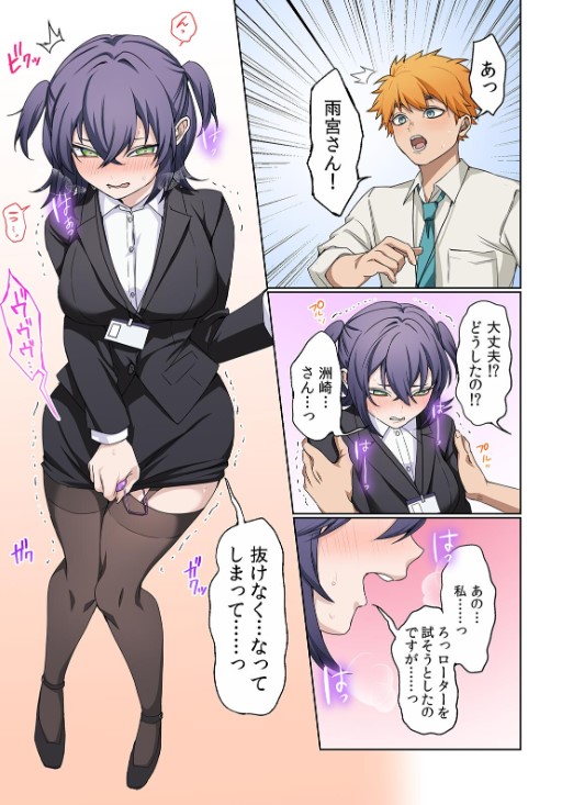 「ナカに入れたら…抜けなく…なって…っ」――新人の雨宮さんは仕事ができて、クールでカワイイ! 俺はそんな彼女にアプローチするも、見事に玉砕して嫌われる始末…。でもある日、部長から雨宮さんと二人で新規事業を任されることに! その内容は…アダルトグッズの企画開発!? 市場調査のため、二人っきりの会議室で大人のオモチャをチェックしていると、雨宮さんが「使用感を確かめます」と言って部屋から出て行ってしまう。数十分後、戻ってきた彼女は顔が真っ赤で…えっ、オモチャが抜けなくなった!? 立っているのもツラそうな雨宮さんを助けるため、俺は彼女のナカに指を…。