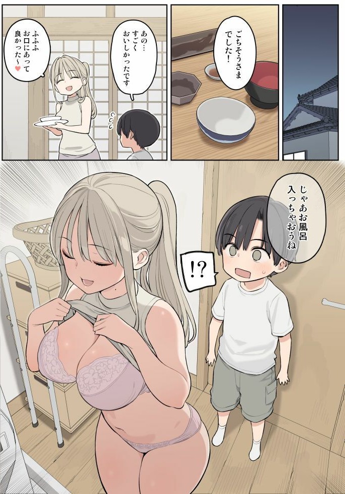 夏休みの間、田舎の叔母の家で過ごすことになったナオ。 叔母の綾乃はナオの初恋の相手で今でも思いを寄せる女性。 そんな二人が一緒にお風呂に入ることになり。 おっぱいを触ることになり、エッチな関係に…そんなお話です。