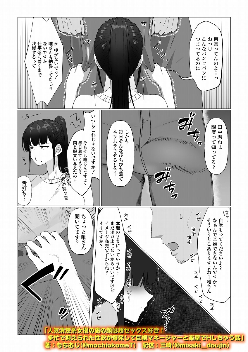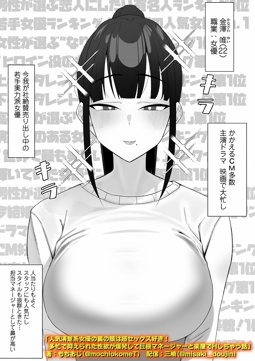わが社が絶賛打ち出し中の若手実力派女優、金澤 唯(かなざわ ゆい)22歳。 人当たりもよく、スタッフにも人気だし、スタイルも抜群。 担当マネージャーとして鼻が高い、のだが… 「おちんちんを」「出しなさ〜い…」 唯さんは、メディアでは絶対に見せてはいけないガンギレ3秒前の表情で俺にそう告げた…。 多忙で抑えられた性欲が爆発した人気清楚系女優が、 巨根マネージャーと楽屋でいちゃいちゃパワハラHしちゃう話です。