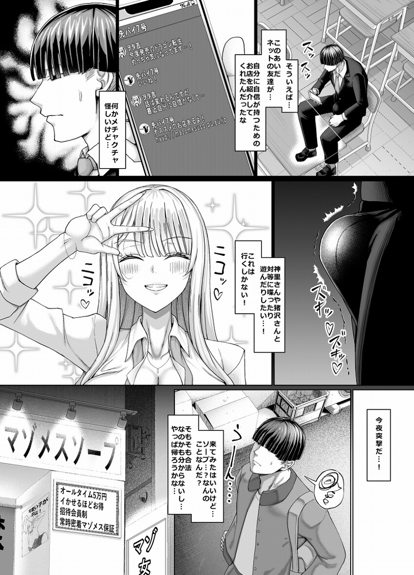 クラスの1軍ギャル、明るく元気で冗談の大好きな白ギャル神里さん、運動神経抜群で無口だけどクールビューティーな猪沢さんコンビにオタクである僕はいつもからかわれてばかり…自分を変えたくて紹介されたソープランドに行くと、そこは女の子をイかせるほどサービスが解禁されるマゾメスソープだった! マゾメスソープのキャストは何とクラスのギャルコンビで…?