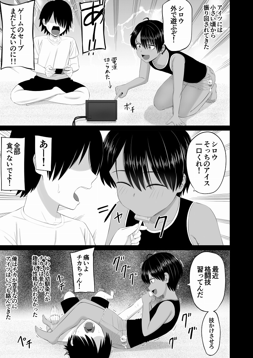 ノッポでコミュ症の史郎くんには他のクラスに陸上部のエースでカースト上位の女子、 郷里チカ(きょうり ちか)という幼馴染がいる チカは男勝りで昔から性格も趣味も合わず振り回されてきたため苦手だったが 高〇生になってからも頻繁に彼女に絡まれてうんざりしていた ある日、宿題を見せてと家に来るチカ(よくあること) ゲームしていた史郎は嫌々 巨乳キャラばかりのゲームをしてるのをチカにからかわれて、恥ずかしイライラ さらに巨乳が好きなら自分の胸を触るかと挑発してくる 普段のフラストレーションが爆発した史郎はチカの胸を鷲掴み チカは冗談となだめるが思春期男子がおっぱいを触ってしまったらもう止まらない チカもあまり抵抗せず何だかいつもより反応が女っぽい ますます興奮した史郎、おっぱいだけでは我慢できるはずもなく パンツの中に手を入れマンコを指でくちゅくちゅ 普段の男勝りな態度はどこへやら、完全にメスの反応をするチカに そのまま勃起したチンポをぶち込む!