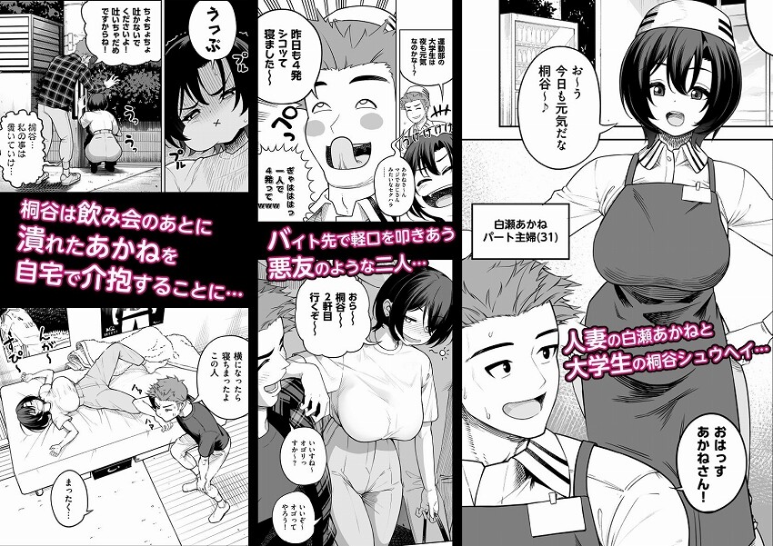 バイト先で悪友のように軽口を叩きあう 大学生の桐谷シュウヘイと人妻の白瀬あかね。 飲み会のあと潰れたあかねを自宅で介抱することに… 日課のオナペット探しで昂った桐谷は あかねの巨乳に手を出してしまう。 調子に乗った桐谷はま◯こに手をかける… 気がついたあかねと桐谷は口論になるが あかねは欲求不満の図星を突かれ閉口してしまう。 久しぶりのSEXの予感が、人妻の心を揺さぶる… あかねは逃げた桐谷を追って風呂場に乗り込み 勃起した桐谷のち◯ぽを掴んで煽る… 「こんなオバサン相手に勃起して…」 「ケダモノね?」 スイッチの入った桐谷に襲われイカされるも、あかねも 桐谷のち◯こを咥えて応戦する。 煽り合っていた二人は… 次第に甘く… いちゃいちゃと… 性欲をぶつけ合う一夜を過ごす キッチン着衣H 爆乳パイズリ 夜通しガン突 熟女の性欲はとどまるところを知らず… 火遊びは一線を超えてしまう… 久しぶりのセックス相手を捕まえた人妻と 性欲旺盛な運動部男子大学生の 煽りあり、イチャラブありの夜通しセックス! ラフな関係から段々と甘くなっていく 巨乳人妻とのSEXをお楽しみください!