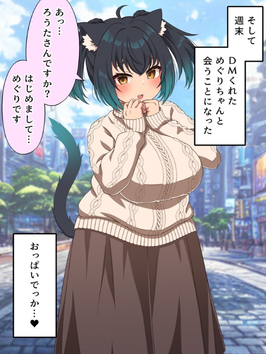 主人公はフォロワー〇万人のエロ絵描き。「おっぱいDMお待ちしてます」とSNSに投稿したところネコミミぽっちゃり爆乳の女の子から自撮りが送られてきた!しかも2人から!!なんやかんやで会う約束してなんやかんやでえっちしちゃいます!