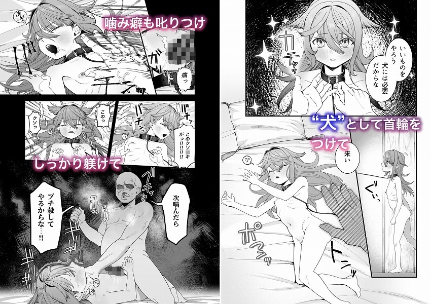ロリを扱っている奴●商から、小さいが気性が荒いので少し安くロリ奴●を買うことができた。 最初は噛み癖がひどく、怯え切っていたが怒鳴りつけてやったらだんだんと自分の状況が理解できたらしい。首輪をつけて地べたに落ちたメシを食う姿はまるで犬みたいだ。 毎回中出し、もちろんお掃除フェラも。リードを引っ張りながら突いてやると嬉しそうに吠える。 毎日オナホとして使ってやると、だんだんご主人様のチンポを求めるようになって、前も後ろの穴も疼いてしかたないみたいで潮を吹き散らかしてる。 今日はどうやって躾けてやろうか…