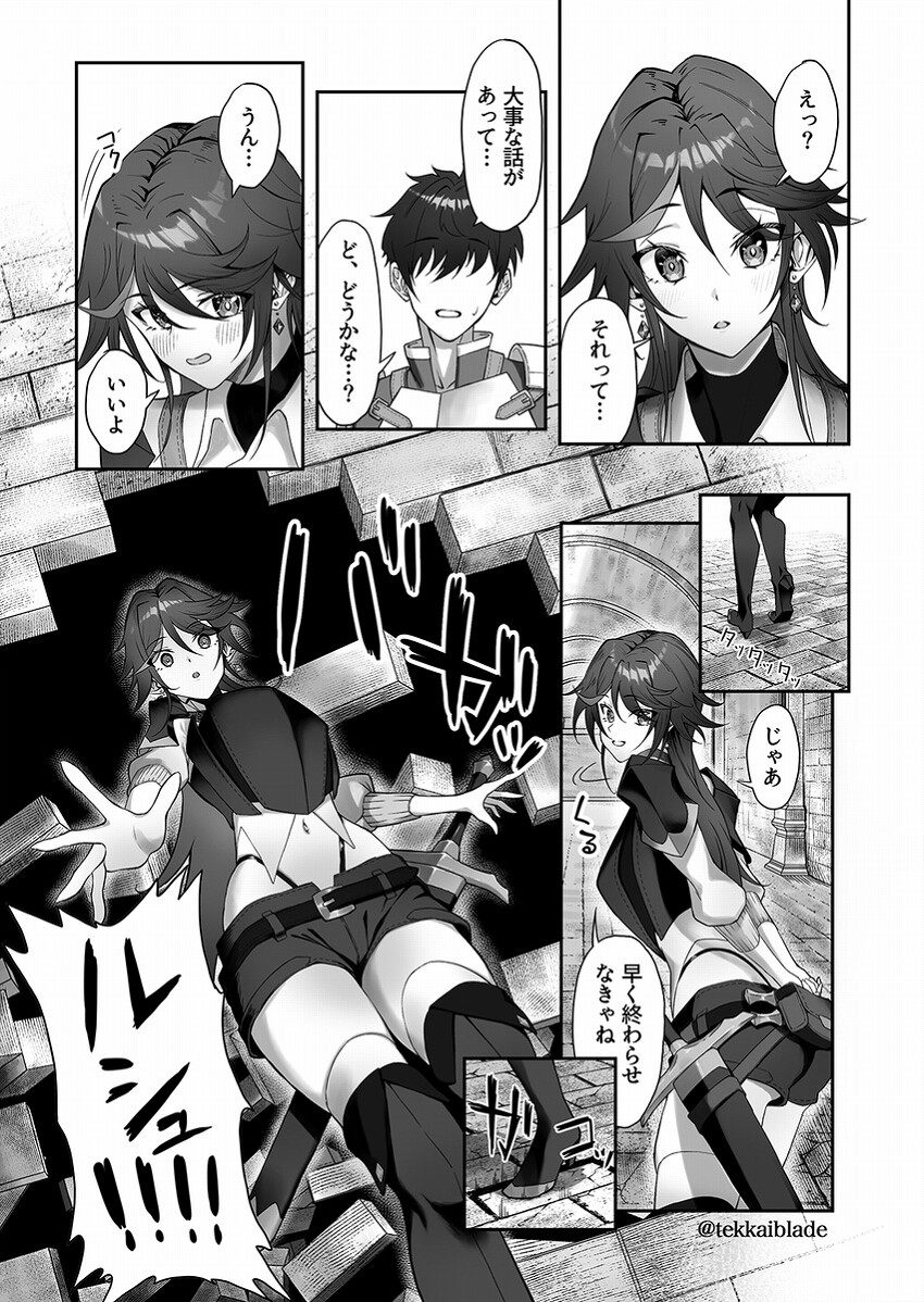 冒険者を生業としているルシュとその仲間達 その日もいつも通りダンジョン探索をこなし、帰還間際 リーダーのジャンから「この後食事でも、どうかなかな?」と誘われる 驚きつつもまんざらでもないルシュは、はにかみながらOKを出す 少し浮かれた、ルシュは小走りをした するとトラップを踏んでしまい、落とし穴に落ちる 階層を跨ぎ仲間達とはぐれてしまう モンスターと戦いながら、合流するべく奔走した矢先 サキュバスから攻撃を受ける 大した攻撃ではなかったが、体の異変に気付く お腹に紋様の様な物が浮かび上がっていた... ルシュはその紋様がすぐに淫紋だと悟る そしてその淫紋がもたらす効果も、冒険者仲間から聞いて知っていた 「まずいこのままじゃあ、合流できない」そう言いながら壁にもたれ掛かる その瞬間、壁は崩れ横穴が姿を表す 進んでみると、それなりの広さの空間に繋がっていた 小さな灯りを頼りに、辺りを確認すると 一匹のゴブリンがそこに佇んでいた、咄嗟に剣を抜き構えた瞬間 「ピィギィィィ」と泣き叫びガタガタと震えるゴブリン その姿に僅かな心咎めを感じ、殺さずに気絶させた 静かになったその部屋で、ルシュは淫紋の解除をするべく ジャンを想いながら、自分を慰めた だが、淫紋は消えることはなく、それどころか益々込み上げてくる感覚を覚えた 不意に気絶しているゴブリンに、目が向いた 一瞬浮かんだ考えに自ら否定した、「無い無い!それは無い!」 それに呼応するかのように、淫紋が疼く この状況を打開する術が無いことも自分自身理解している このまま戻るわけにもいかない ここには、自分とゴブリンのみ... ルシュは一つの案を浮かべた「スマタなら...」 ゴブリンの身包みに手を掛けた... 淫紋を付与されたルシュはゴブリンを使う 果たして淫紋を解除して仲間の元へ無事戻れるのか?